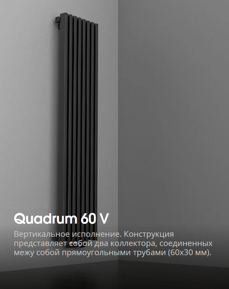 Радиаторы Quadrum выпускаются в вертикальном и горизонтальном и напольном исполнении, а диапазон монтажной высоты составляет от 300 до 2000 мм. По заказу возможно правое, левое или центральное нижнее подключение.